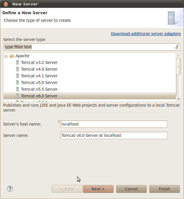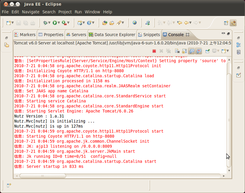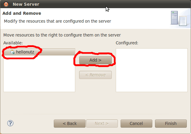 如果你已经在 Eclipse 中创建了一个 Tomcat 服务器,请跳过本步骤,直接将项目 hellonutz 添加到这个服务器中即可