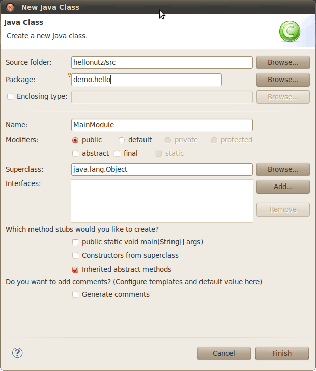 打开刚才创建的 MainModule.java,添加一个函数,整个类的源代码如下: