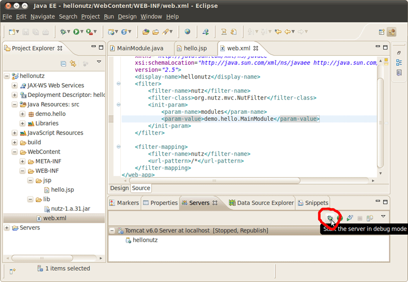 点击 'Finish' 按钮,在 Servers 视图应该出现一个 Tomcat 服务器,这个服务器下应该有一个项目 -- hellonutz
