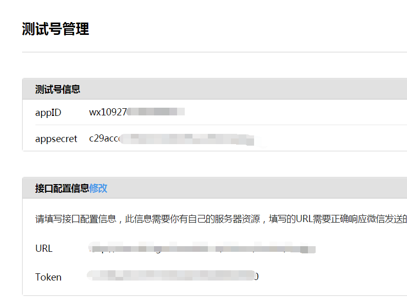 打开测试号管理页面, 填入上一步测试过的外网地址及WeixinModule的token值,按确认