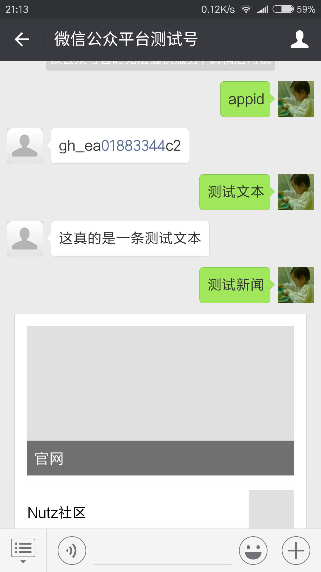 现在,确保ngrok已经启动, 访问地址 http://$用户名.ngrok.wendal.cn/$项目名称/weixin/msgin